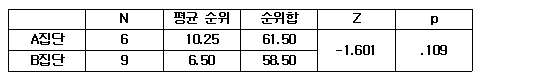 Z=-1.601 p=.109로 유의하지 않은 결과가 나옵니다