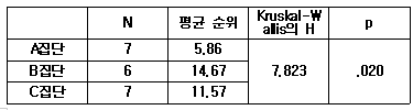 H=7.823, p=.020으로 유의수준 5% 기준에서 차이가 있다는 결과가 나옵니다