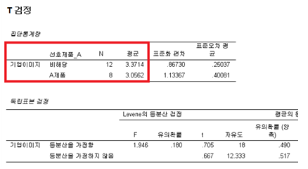 A제품을 선호하지 않는 사람의 기업이미지 평가가 조금 더 후하지만, 유의한 차이는 아니네요