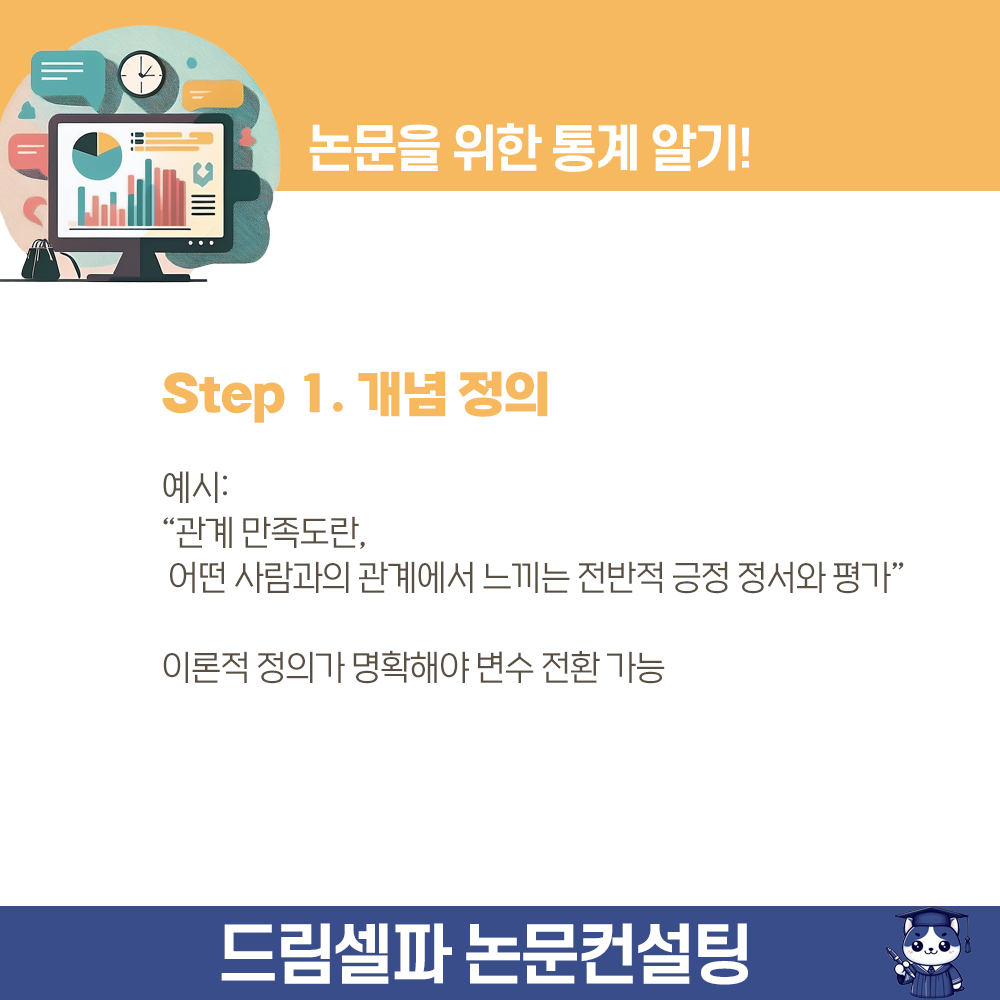 예를 들어, 관계 만족도나 자아존중감 같은 단어들은 연구자가 주목하는 중요한 주제이지만 그대로는 수치로 측정할 수 없습니다. 그래서 개념은 주로 논문의 서론이나 이론적 배경 부분에서 등장합니다.