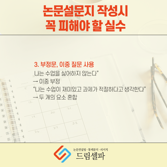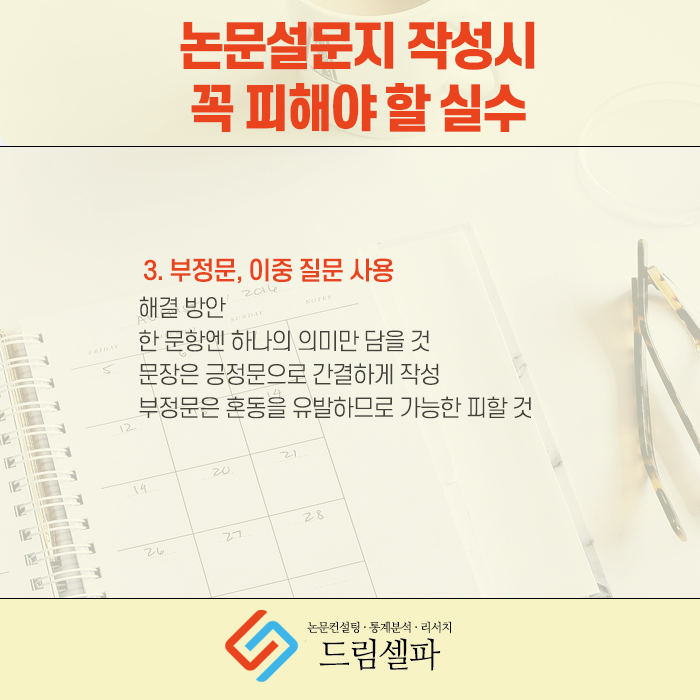 이러한 문제를 피하기 위해서는 한 문항에 하나의 의미만 담고, 긍정문으로 간결하게 표현하는 것이 중요합니다.
